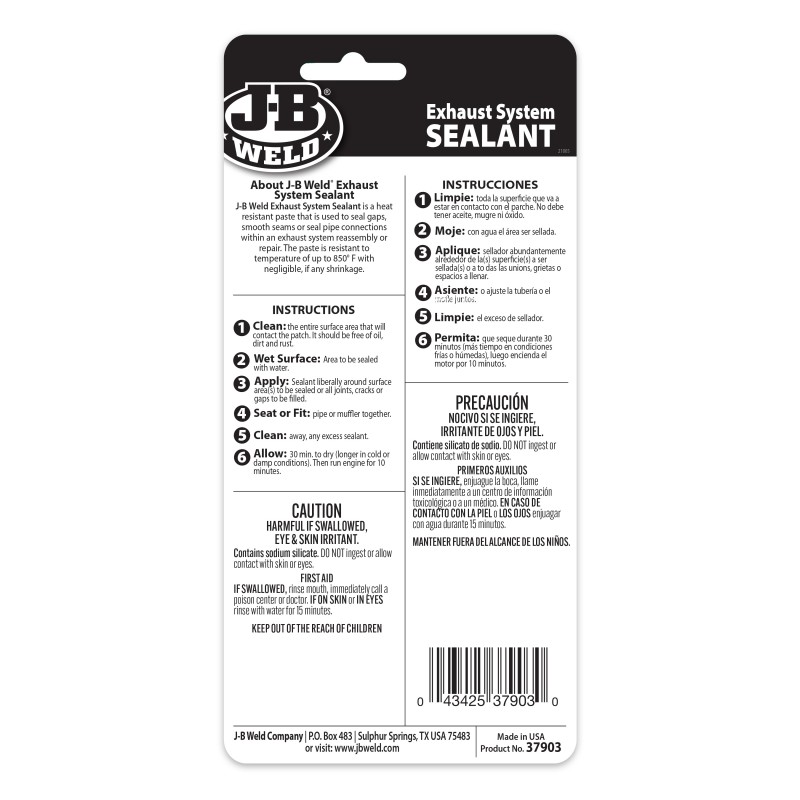 J-B Weld Exhaust system sealant is a heat-resistant paste that is used to seal gaps, smooth seams, or seal pipe connections within an exhaust system reassembly or repair. The paste is resistant to temperatures of up to 850F with negligible, if any, shrinkage. Great for use on mufflers, tailpipes, exhaust systems, and catalytic converters.