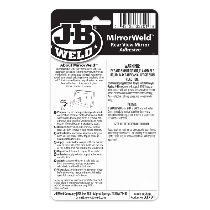 J-B Weld MirrorWeld is a specially formulated adhesive specifically designed to bond rear view mirrors to windshields. It can be used to install new mirrors, as well as re-attach existing mirrors that have fallen off. This strong and fast-acting adhesive can also be used to bond other metal & glass items, ceramics & jewelry.