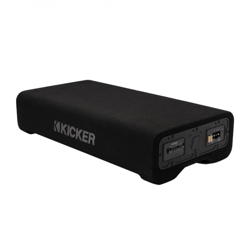 Kicker's 51PTRTP12 powered subwoofer enclosure combines a 500-watt amplifier with a low-profile CompRT 12" subwoofer and a 12" Kicker reFLEX passive radiator in a downward-firing box that brings Kicker bass power to the crowded spaces of todays cars and trucks. The passive radiator reacts to the air pressure produced by the active sub, adding extra low-end thump without the noise of a ported enclosure.