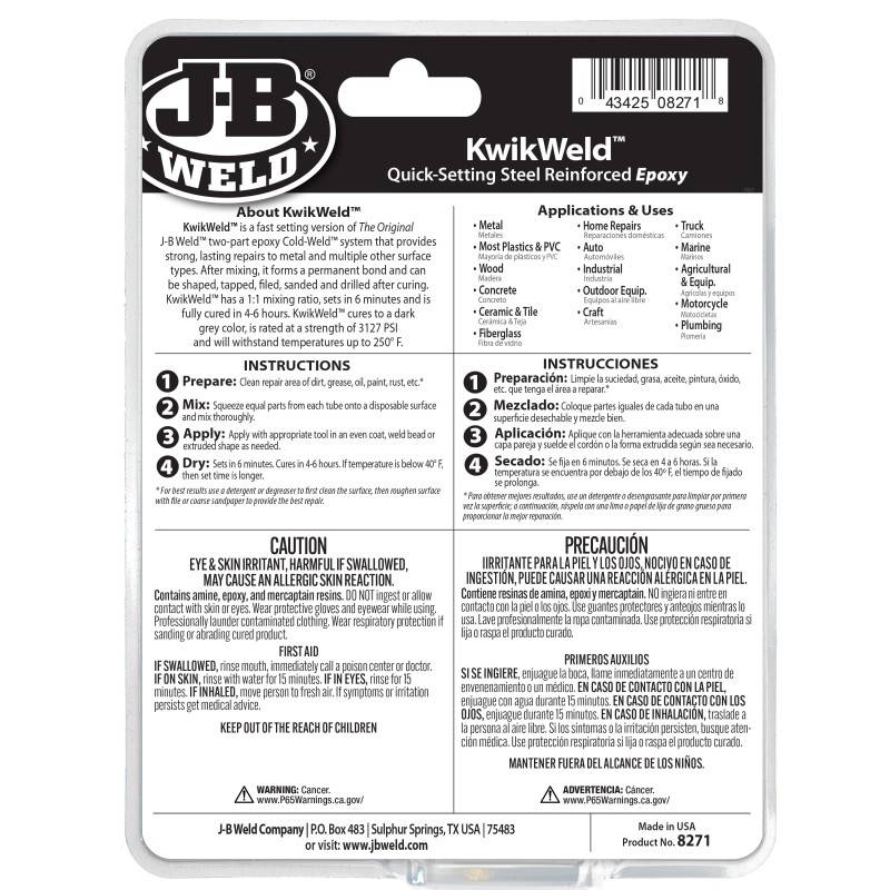 J-B Weld KwikWeld is a fast-setting version of The Original J-B Weld two-part epoxy cold weld system that provides strong, lasting repairs to metal and multiple other surface types. After mixing, it forms a permanent bond and can be shaped, tapped, filed, sanded, and drilled after curing. J-B KwikWeld has a 1:1 mixing ratio, sets in 6 minutes, and is fully cured in 4-6 hours. J-B KwikWeld cures to a dark grey colour, is rated at a tensile strength of 3127 PSI, and will withstand temperatures up to 230F.