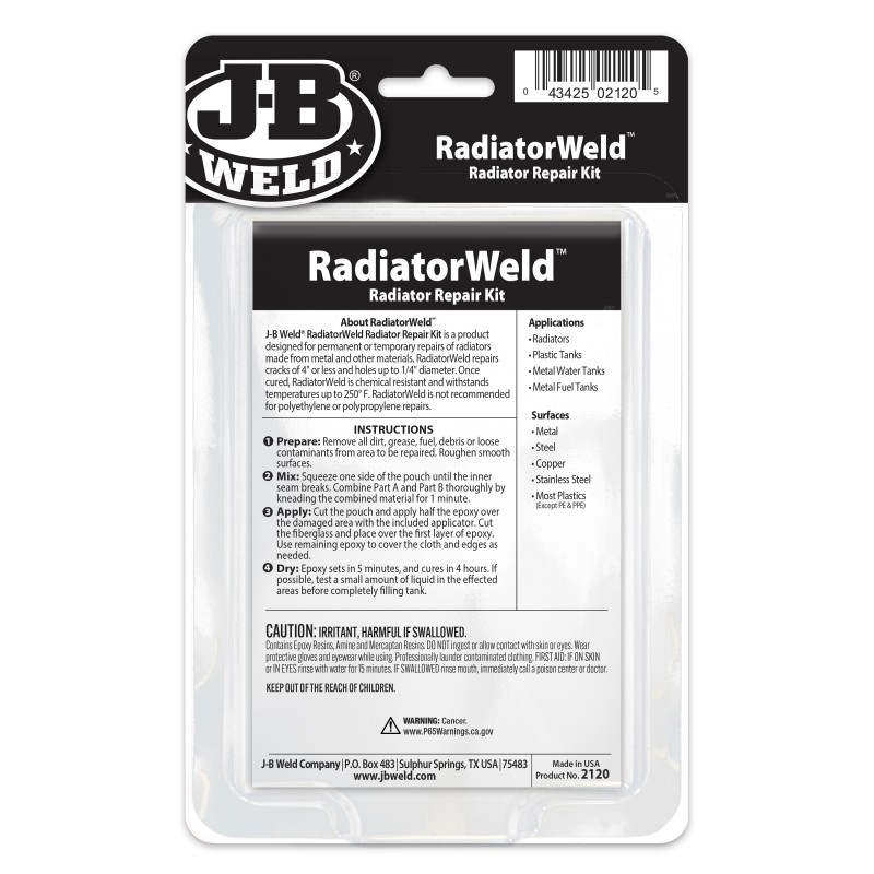 J-B Weld RadiatorWeld Radiator Repair Kit is a product designed for permanent or temporary repairs of radiators made from metal and other materials. RadiatorWeld repairs cracks of 4IN or less and holes up to 1/4" diameter. Once cured, it is chemical resistant and withstands temperatures up to 250 F. This kit is not recommended for polyethylene or polypropylene repairs.