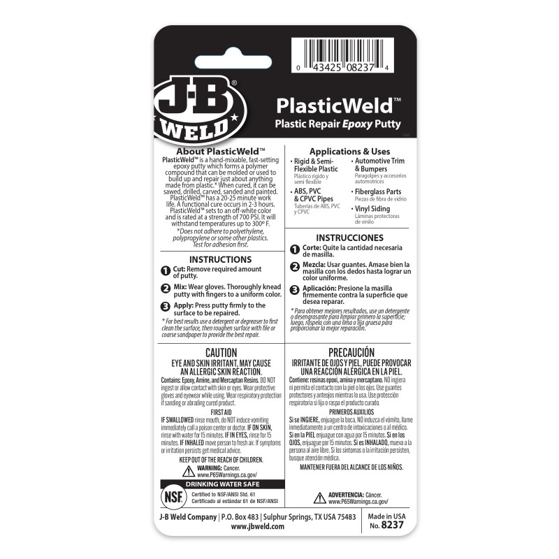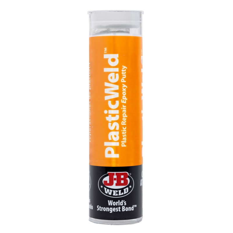 PlasticWeld is a hand-mixable, fast-setting epoxy putty that forms a durable bond to most major plastic types. After mixing, it forms a polymer compound that can be moulded or used to build up and repair just about anything made from plastic. When cured, it can be sawed, drilled, carved, sanded, and painted. PlasticWeld has a 20-25 minute work life; functional cure occurs in 2-3 hours. PlasticWeld cures to an off-white colour, is rated at a tensile strength of 700 PSI. Does not adhere to polyethylene, polypropylene, or some other plastics. Test for adhesion first.