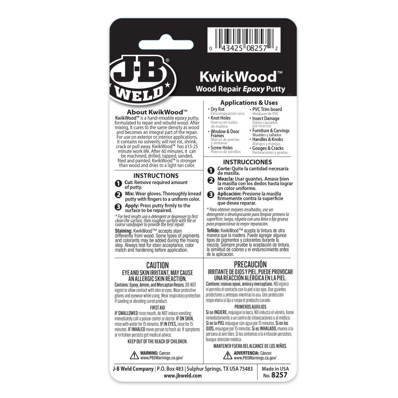 KwikWood is a hand-mixable epoxy putty, formulated to repair and rebuild wood. After mixing, it cures to the same density as wood and becomes an integral part of the repair. For use on exterior or interior applications, it contains no solvents, will not rot, shrink, crack, or pull away. KwikWood has a 15-25 minute work life. After 60 minutes, it can be machined, drilled, tapped, sanded, filed, and painted. Stronger than wood, KwikWood dries to a light tan colour.