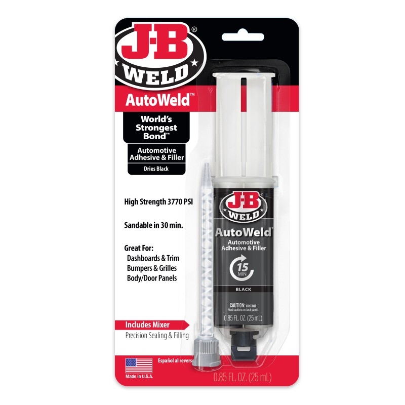 J-B Weld AutoWeld is a high-strength, impact-resistant automotive adhesive, filler & sealer. Great for bumpers & grilles, dashboard & trim, body/door panels. Includes one single-use Static Mixer.